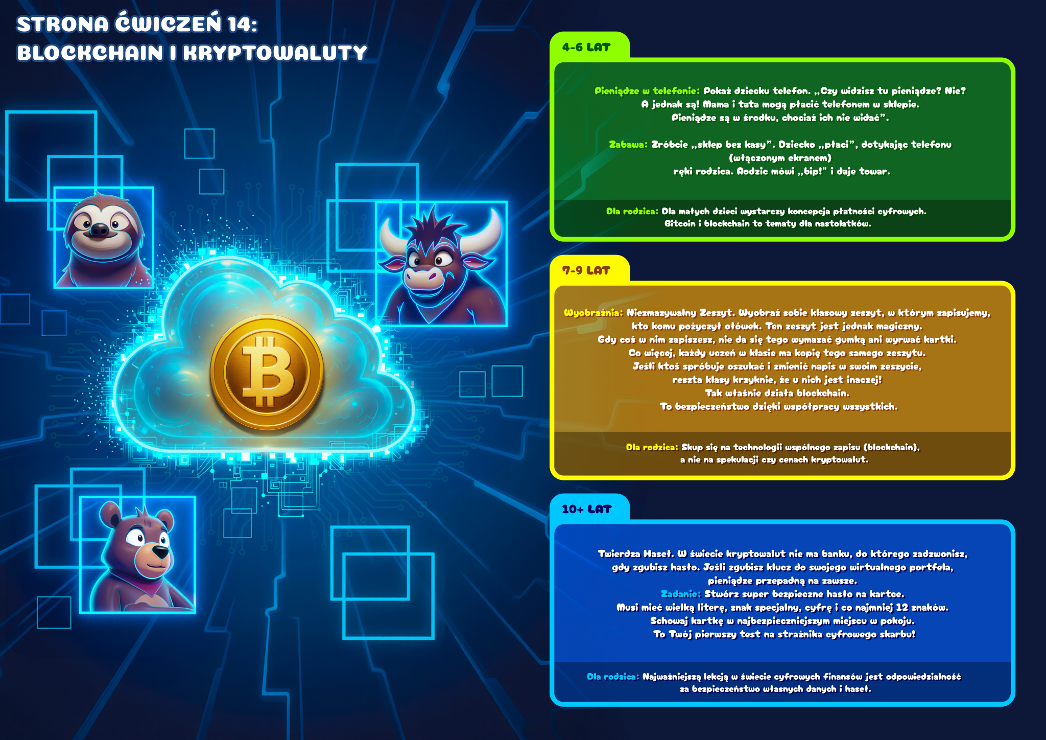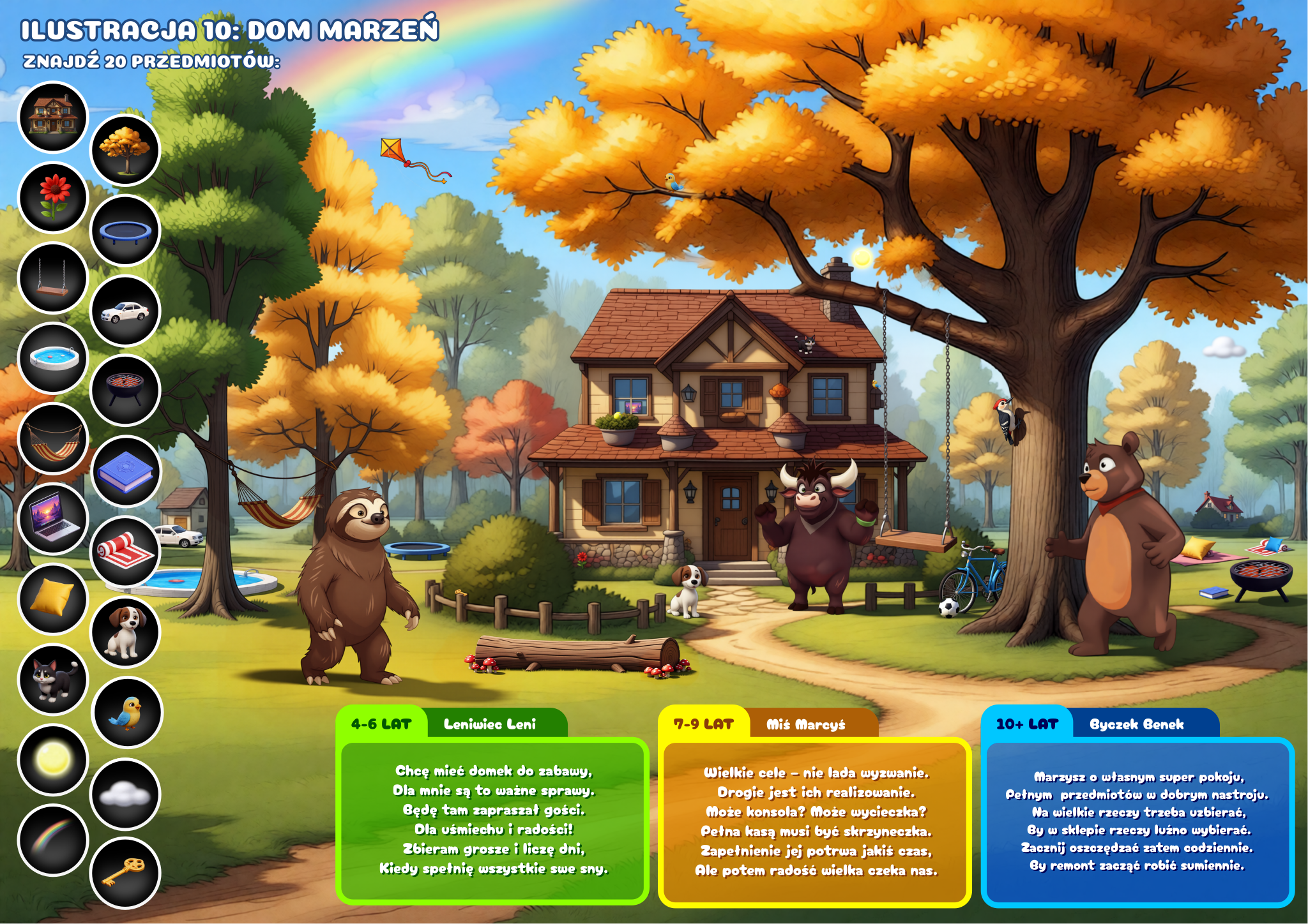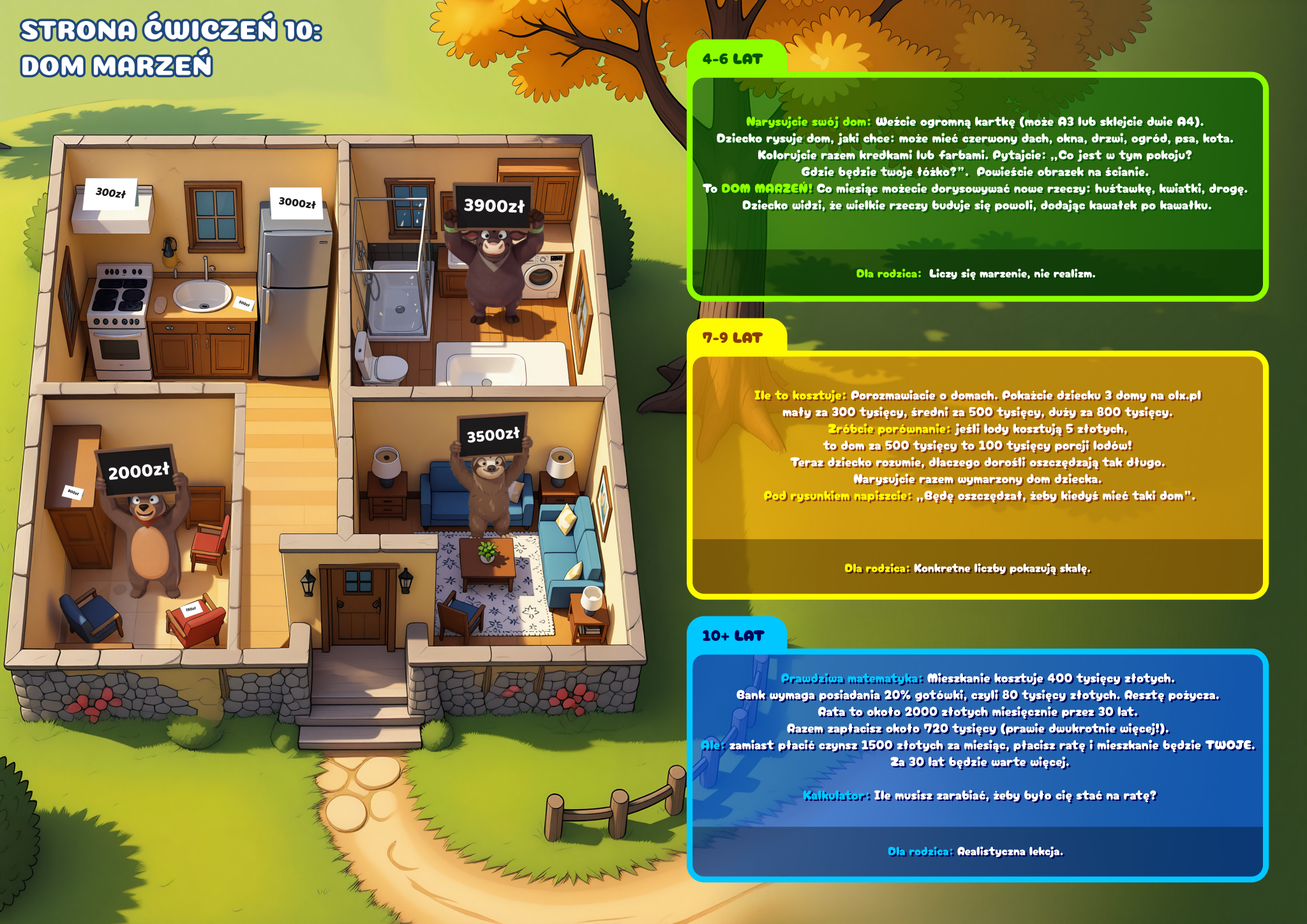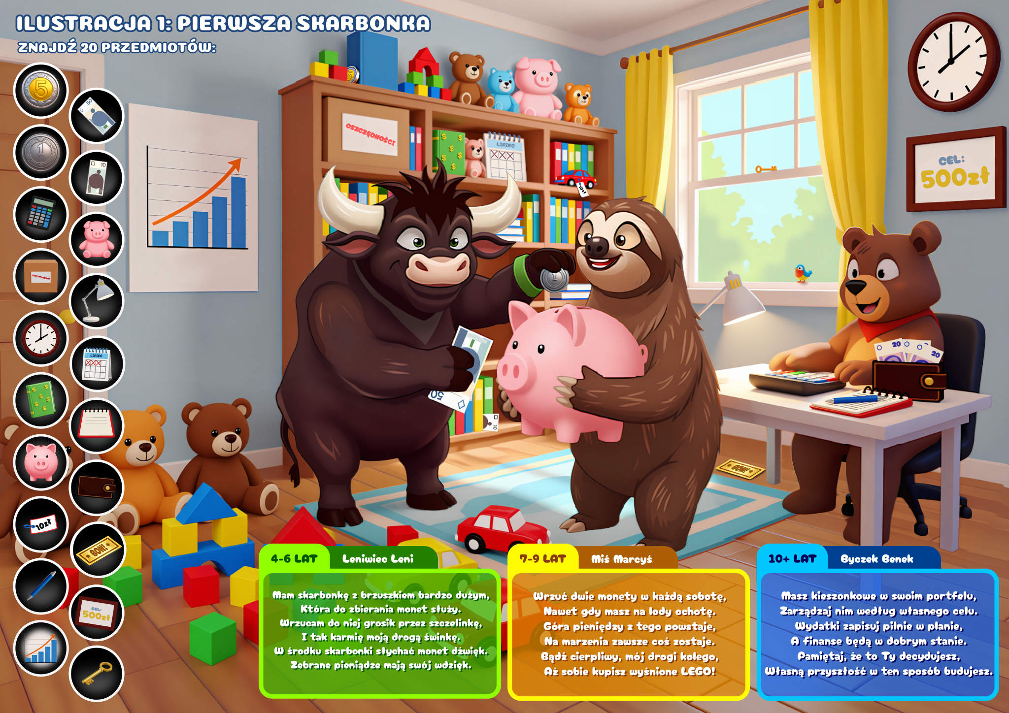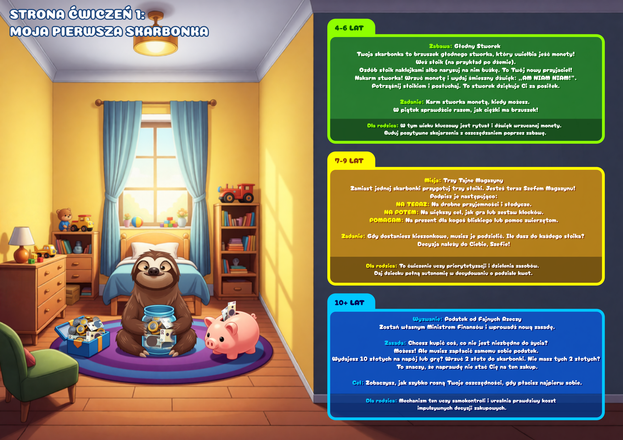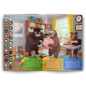3 poziomy trudności w każdej scenie. Jedna książka, trzy różne doświadczenia: 4–6 lat – proste historyjki, szukanie i liczenie (opowiada Leniwiec Leni), 7–9 lat – pierwsze pojęcia finansowe, pytania do rozmowy (opowiada Miś Marcyś), 10+ lat – pełne lekcje z przykładami z życia (opowiada Byczek Benek)