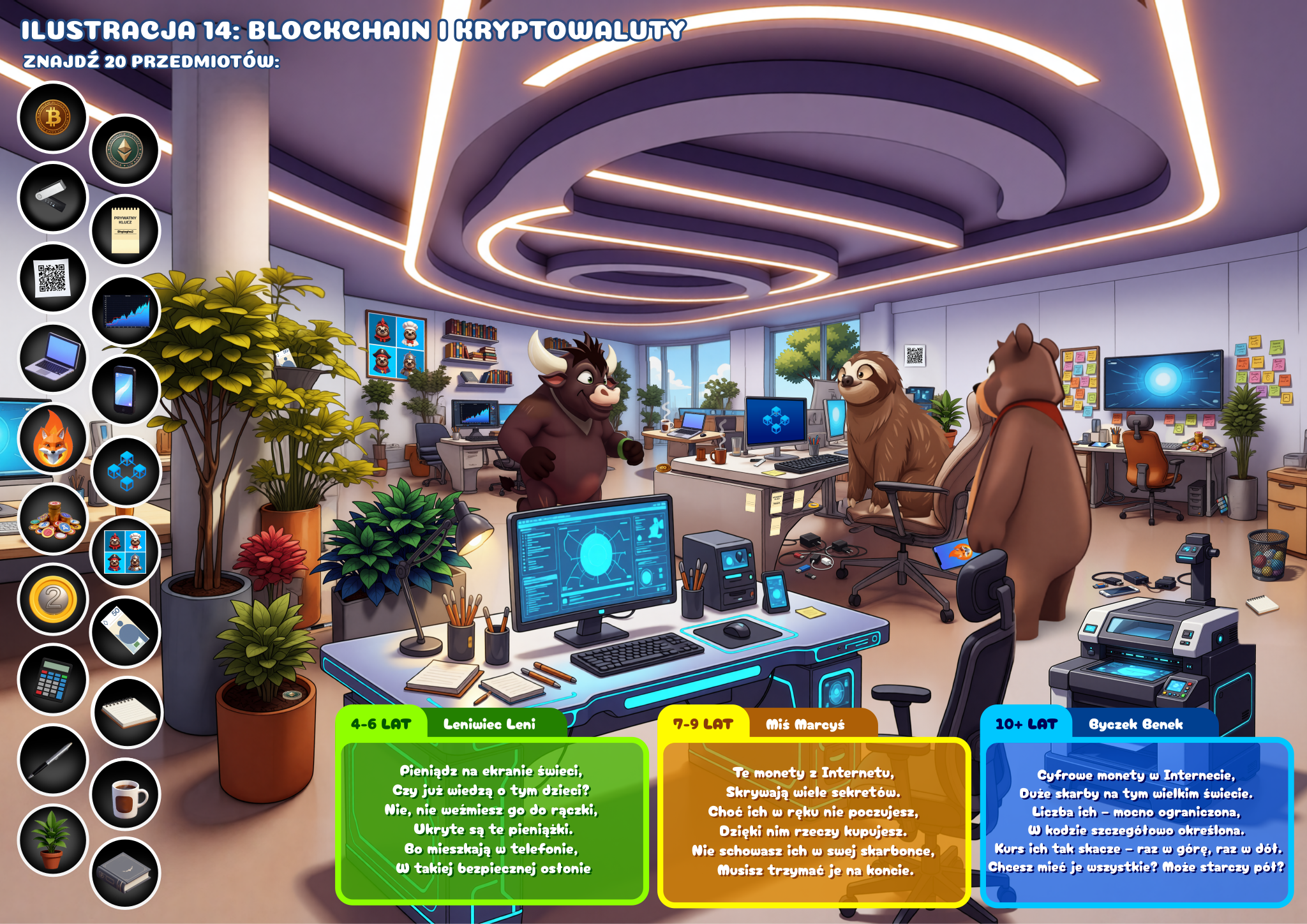 15 dużych, szczegółowych ilustracji. Każda to osobna scena finansowa: od stoiska z lemoniadą po własny sklep, od skarbonki po giełdę. Ponad 300 ukrytych przedmiotów do znalezienia.